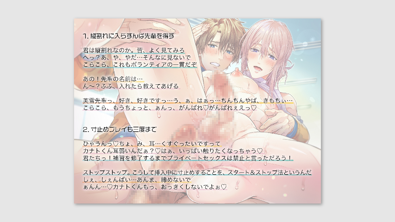 「一般教養科目のセックス♂実習で憧れの先輩と本気ペアリング」/佐竹梅子様 2024年6月19日 2024年7月20日 画像デザイン ワンクッション ※R-18作品になります。閲覧はご注意ください。 音声作品ジャケットデザイン DLページはこちらから。 あらすじ
