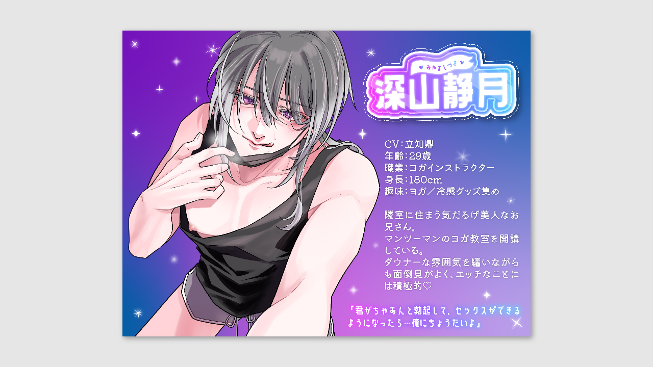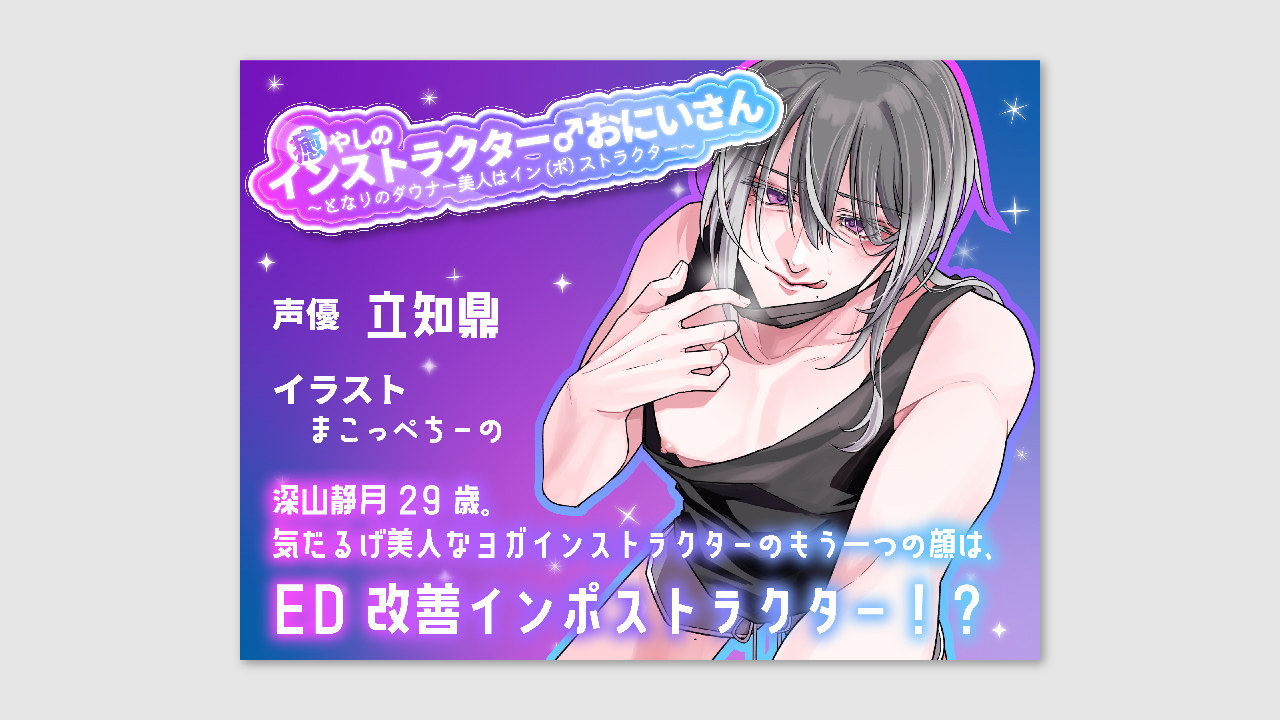 癒やしのインストラクター♂お兄さん/佐竹梅子様 2024年7月20日 2024年8月3日 画像デザイン ワンクッション ※R-18作品になります。閲覧はご注意ください。 音声作品ジャケットデザイン DLページはこちらから。 プロフィール